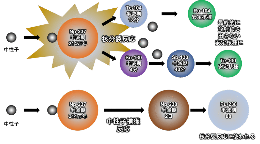 マイナーアクチニドであるネプチニウム237(Np-237、半減期:214万年)を核変換する上で、次のような核分裂反応や中性子捕獲反応が起こります。最終的に放射線を出さない安定核種に変わったり、核分裂反応に使われる燃料に変わったりします。